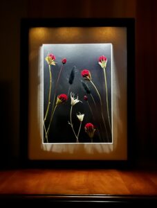Kuivatatud lilled on kui looduse uinuvad kaunitarid, kelle eriline ilu ja salapära avardub sumedas ja soojas valguses, ja kes on oma uue võimaluse leidnud raamitud ajatus ruumis. Valguspildis saavad kokku taimede haprus, õrnus, ajatu igavikuline olek ja taustsüsteemi konkreetsus.